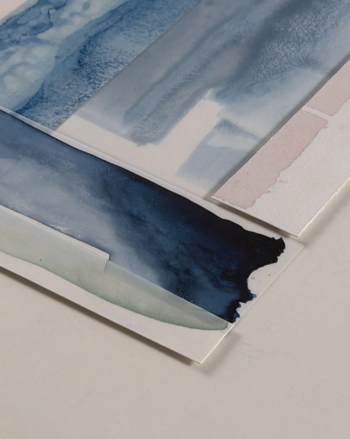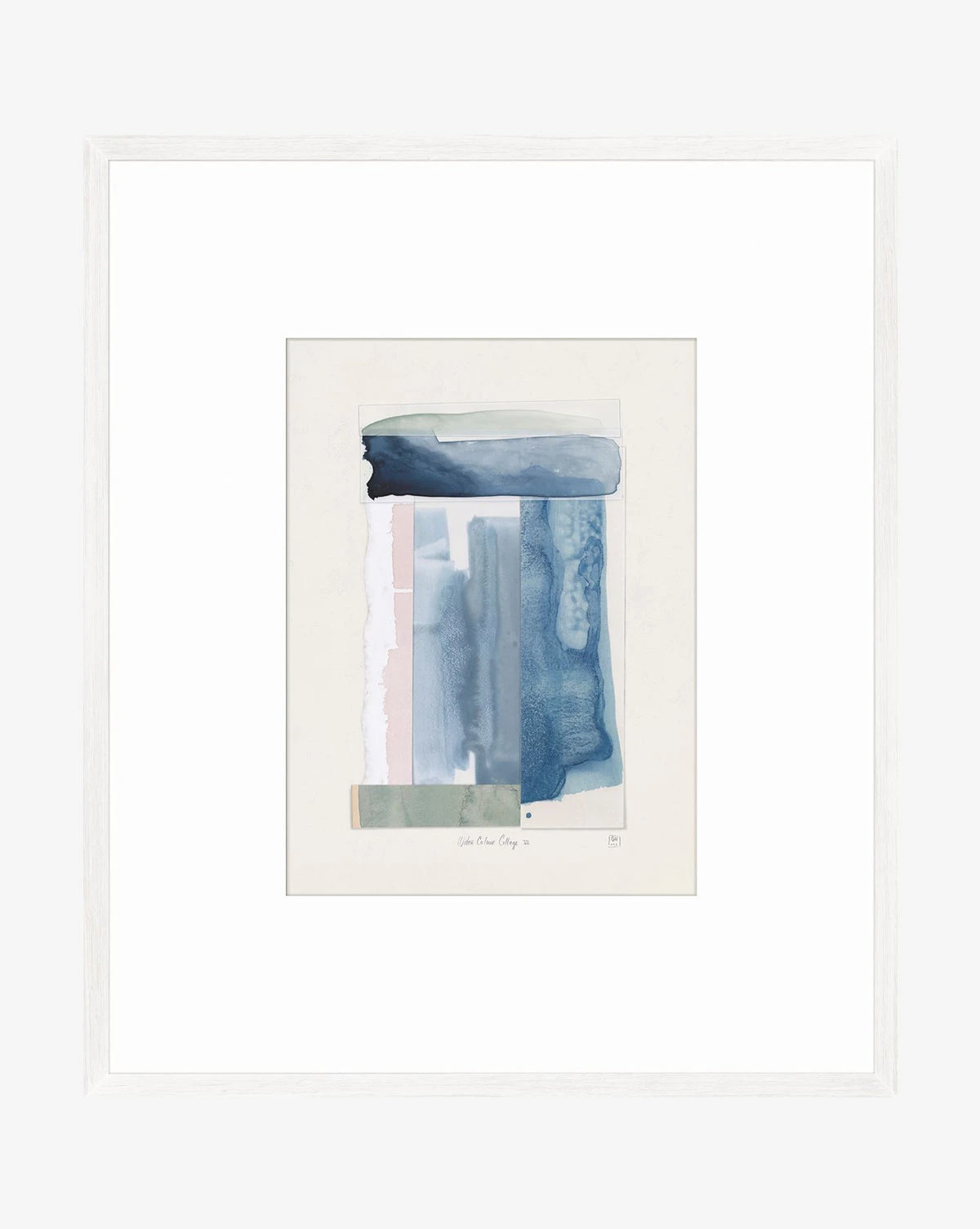 An abstract expression of color, Blue Watercolor VI uses watercolor to play with tones and dimension. Composed in a collage to further highlight its hues, Blue Watercolor VI is framed in a soft, off-white frame with clear grade A glass, complete with artist enhanced details.