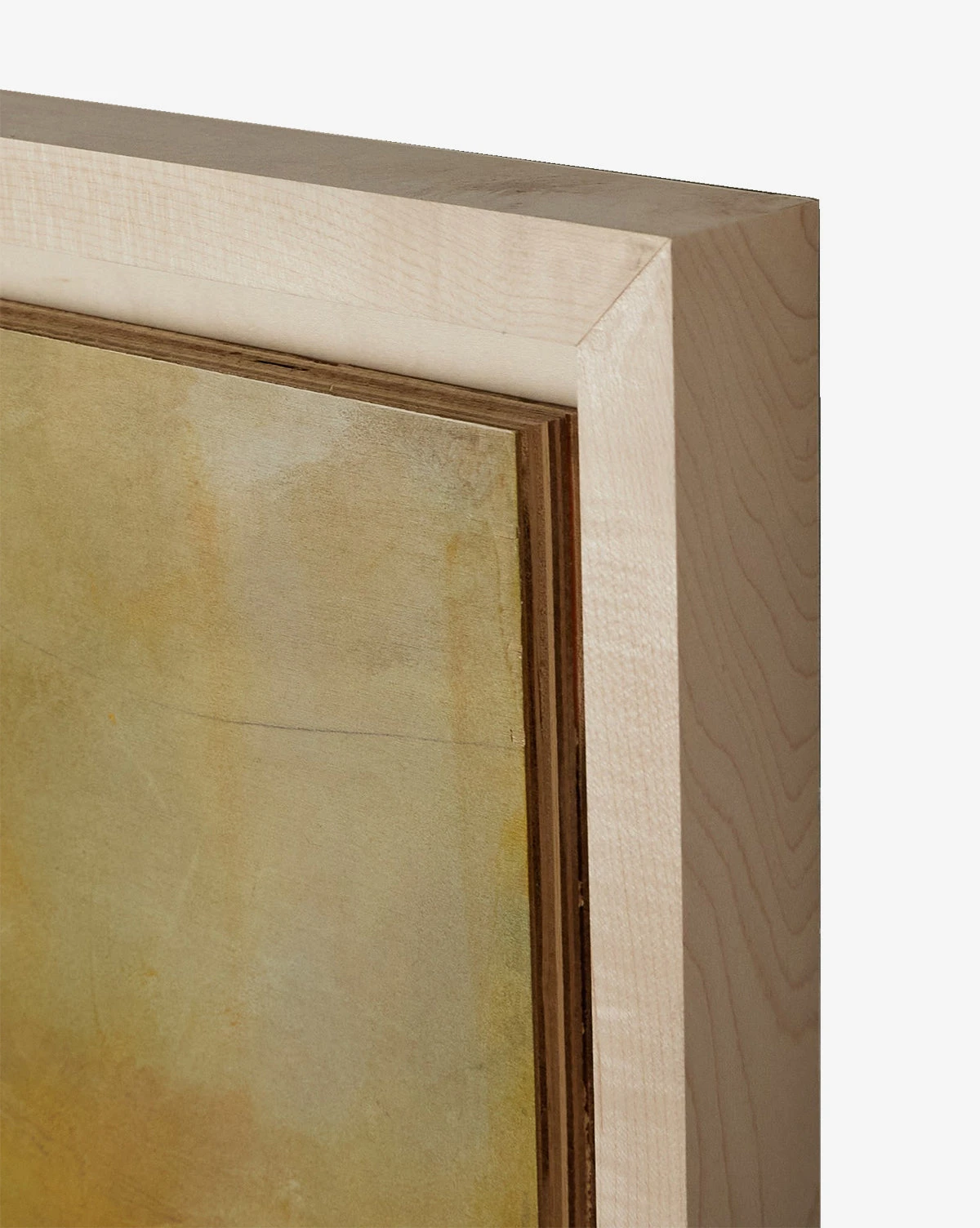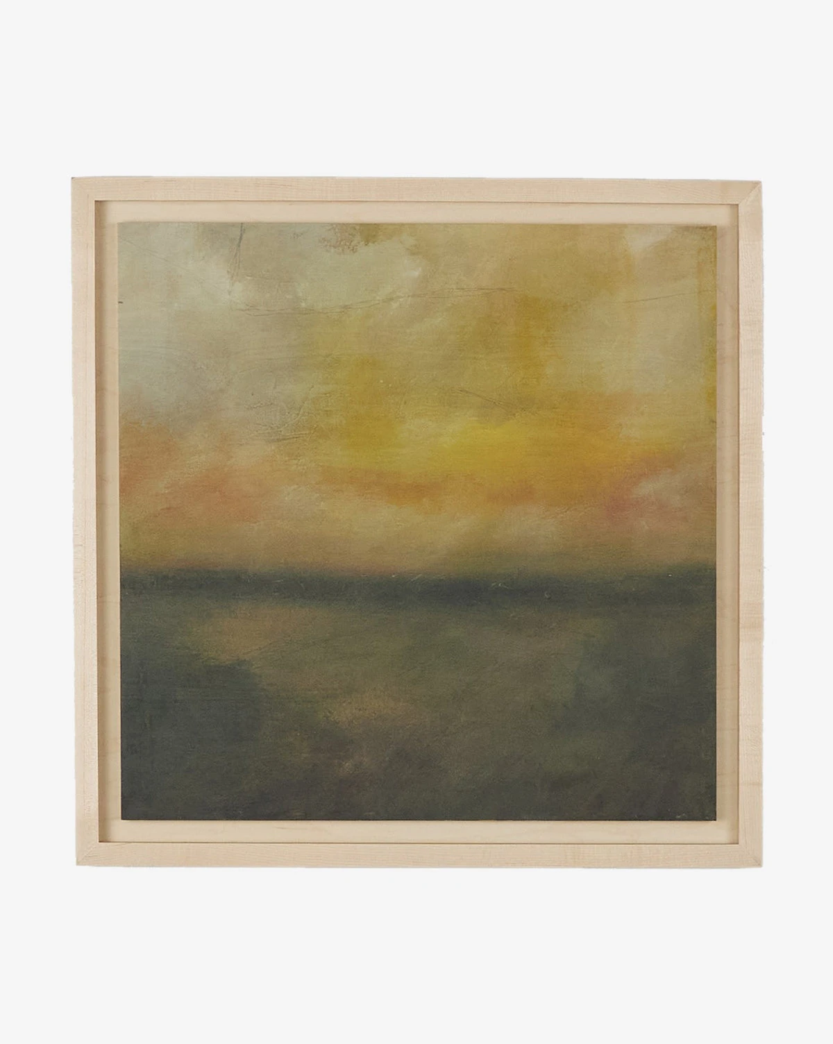 Evoking the feeling of a warm sunset, Dawning plays with a beautiful juxtaposition of light and dark. Presented within a natural maple frame, the piece by artist Melanie Biehle brings a moment of serenity wherever it’s placed. Â