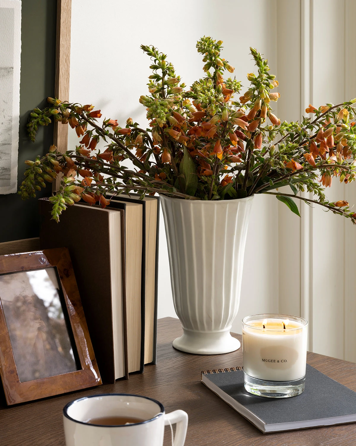 Made with a fluted texture, the Delphi Footed Vase is a classic piece for console or built-in vignettes. Versatile and beautiful, this vase is made from stoneware with a satin glaze finish.Â