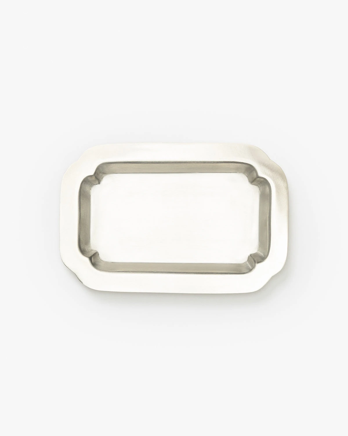 A beautiful and bold accessory, the Feliciano Silver Tray adds vintage-inspired detail to your decorative vignettes with its silver finish. The shallow tray with a shaped border brings practical elegance to coffee tables or consoles.