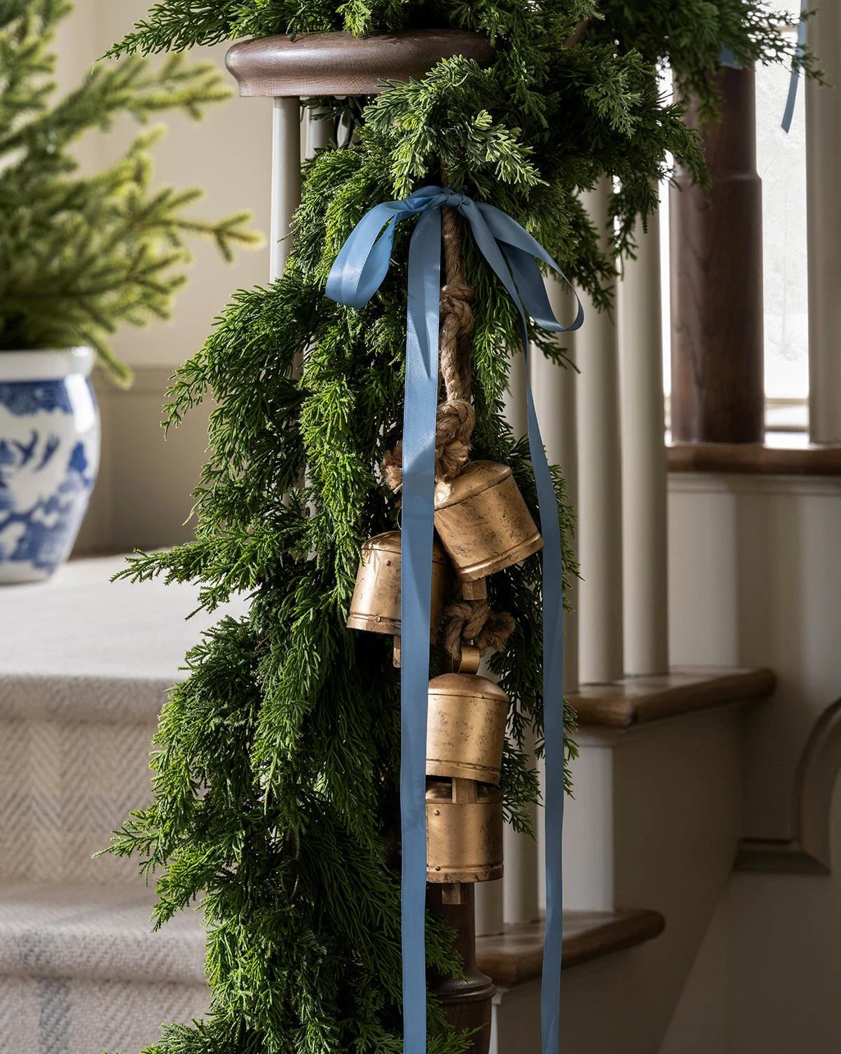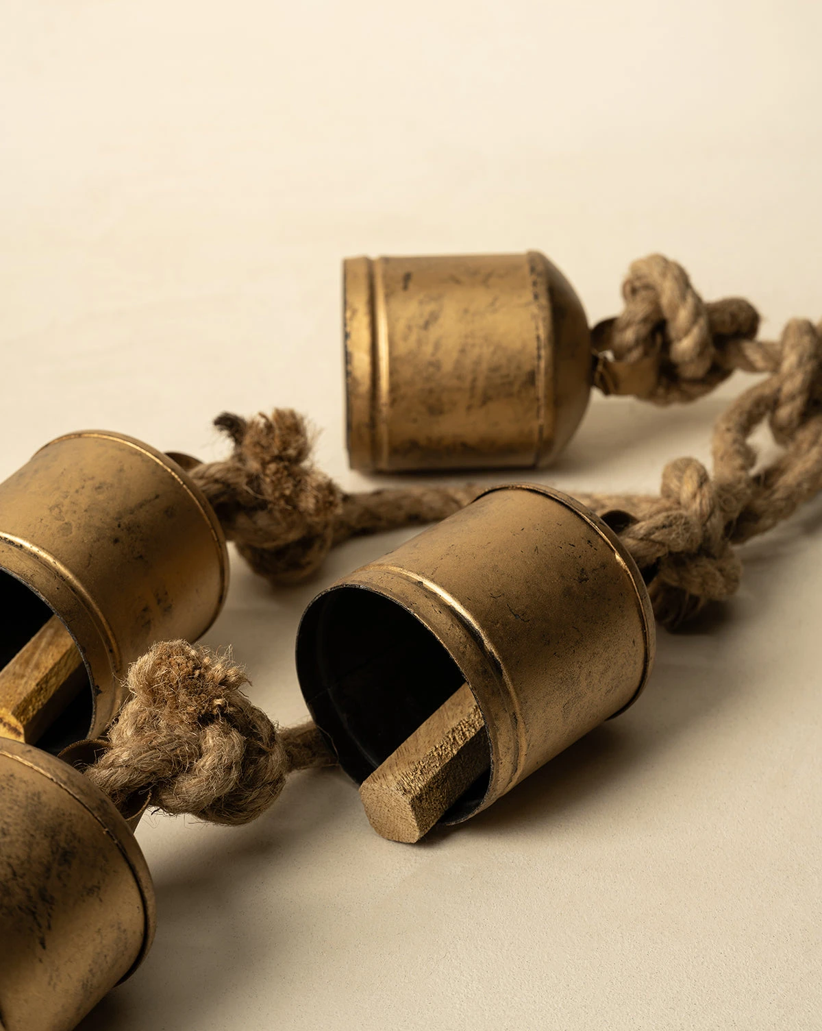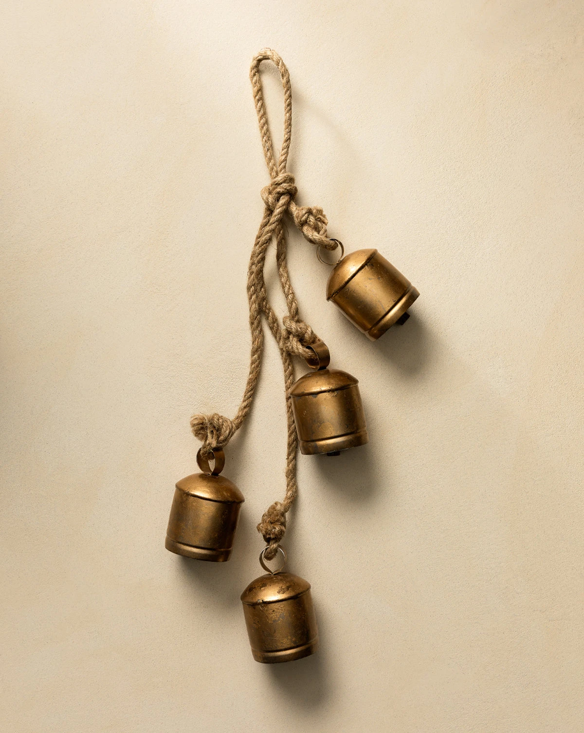 The Hanging Iron Bells are a charming addition to everything from trees to doorways to coffee tables during the holiday season. Each bell is crafted from iron with a gold finish, and the cluster is tied together with rope for a natural touch of organic material.