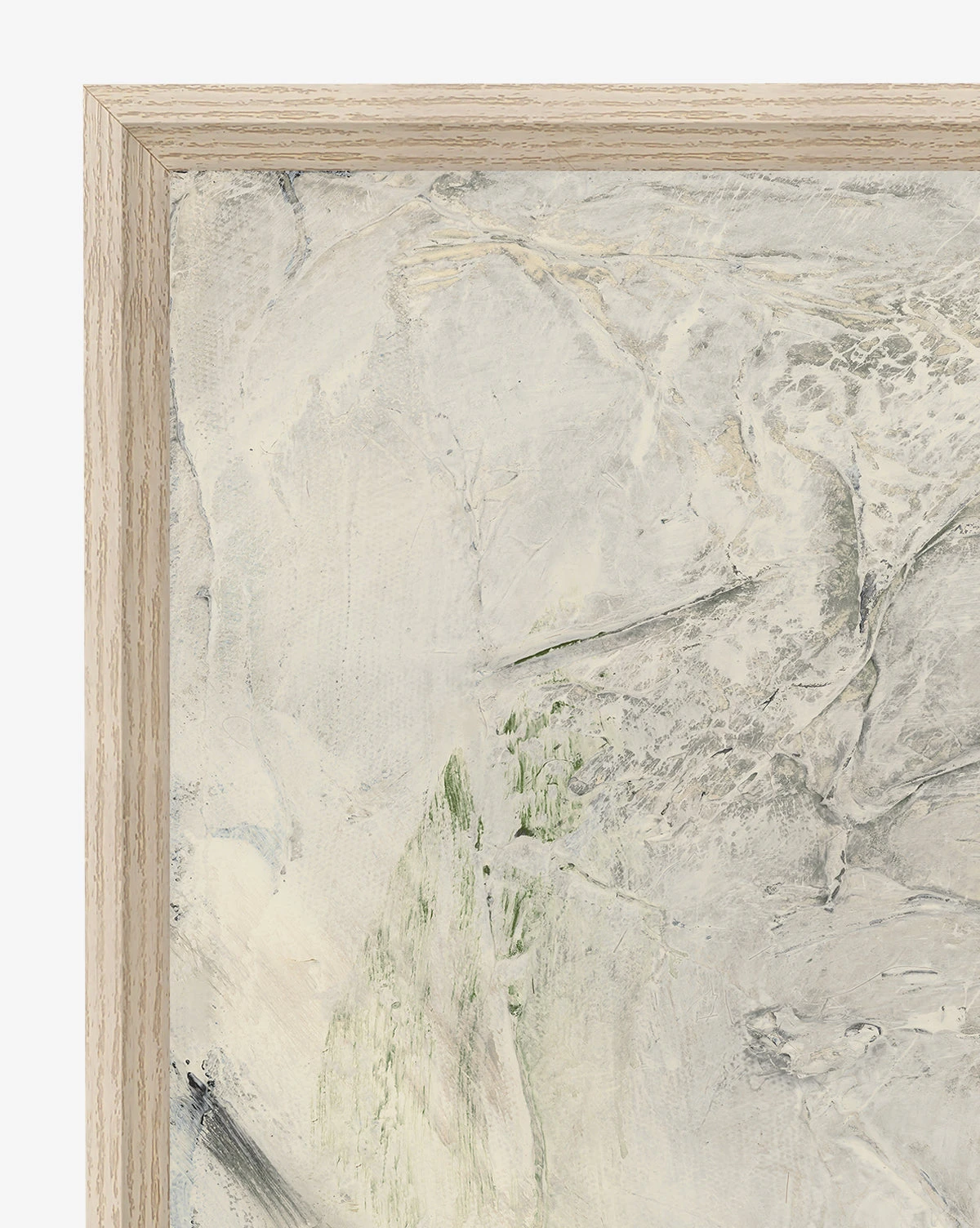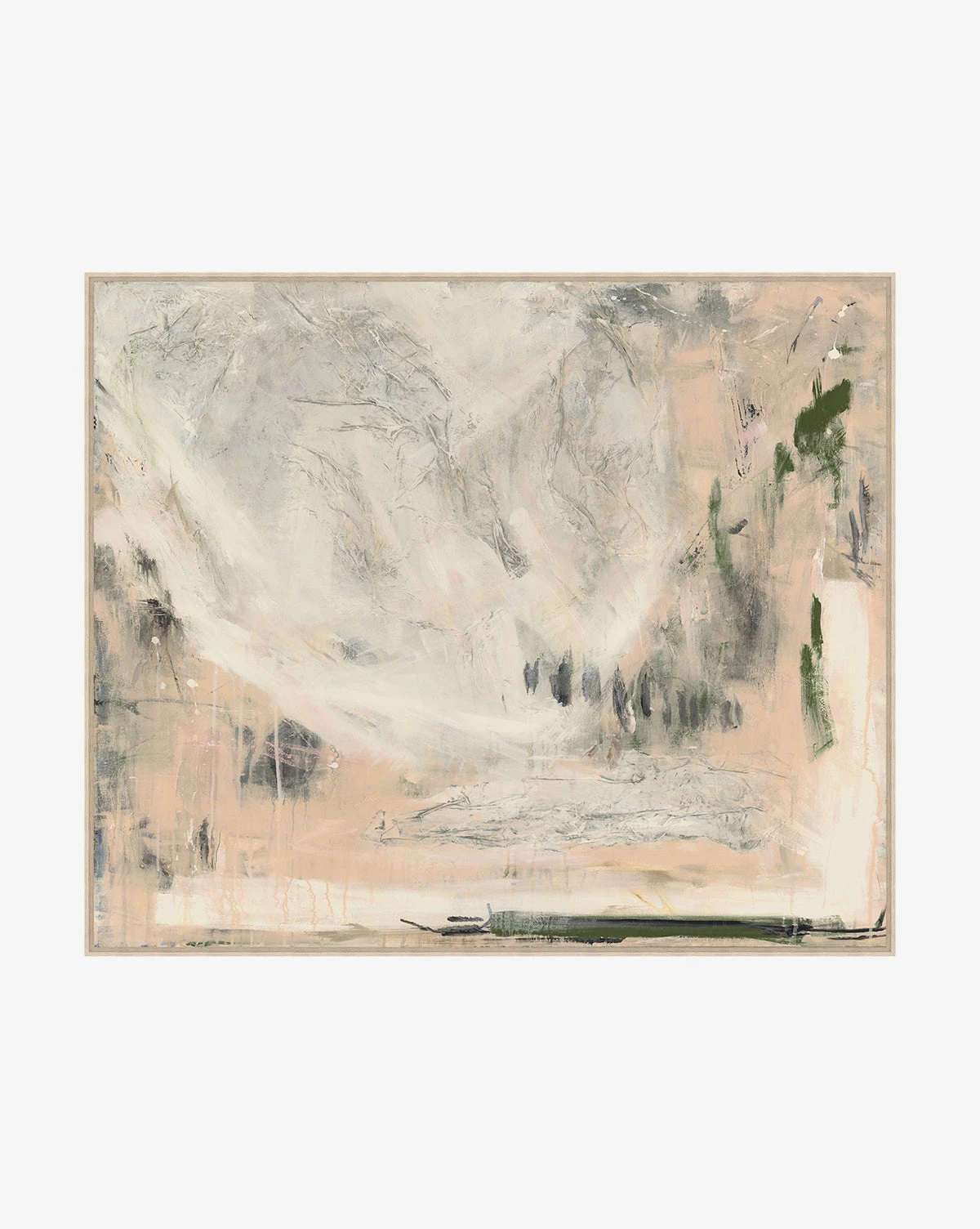 An abstract take on landscape, In the Valley uses a pronounced palette of warm beige, cream, and green on canvas to create a composition that is reminiscent of nature. Its brushed strokes are distinguished, giving the piece a touch of added movement and texture to bring the scene to life.