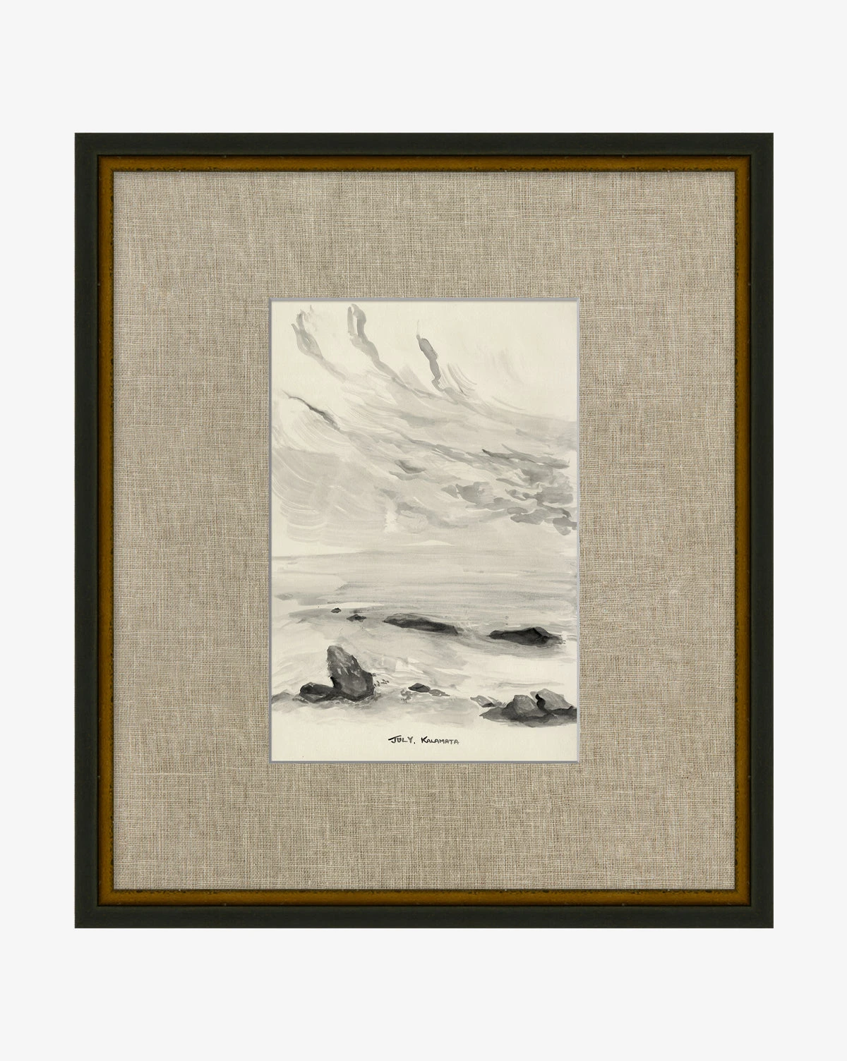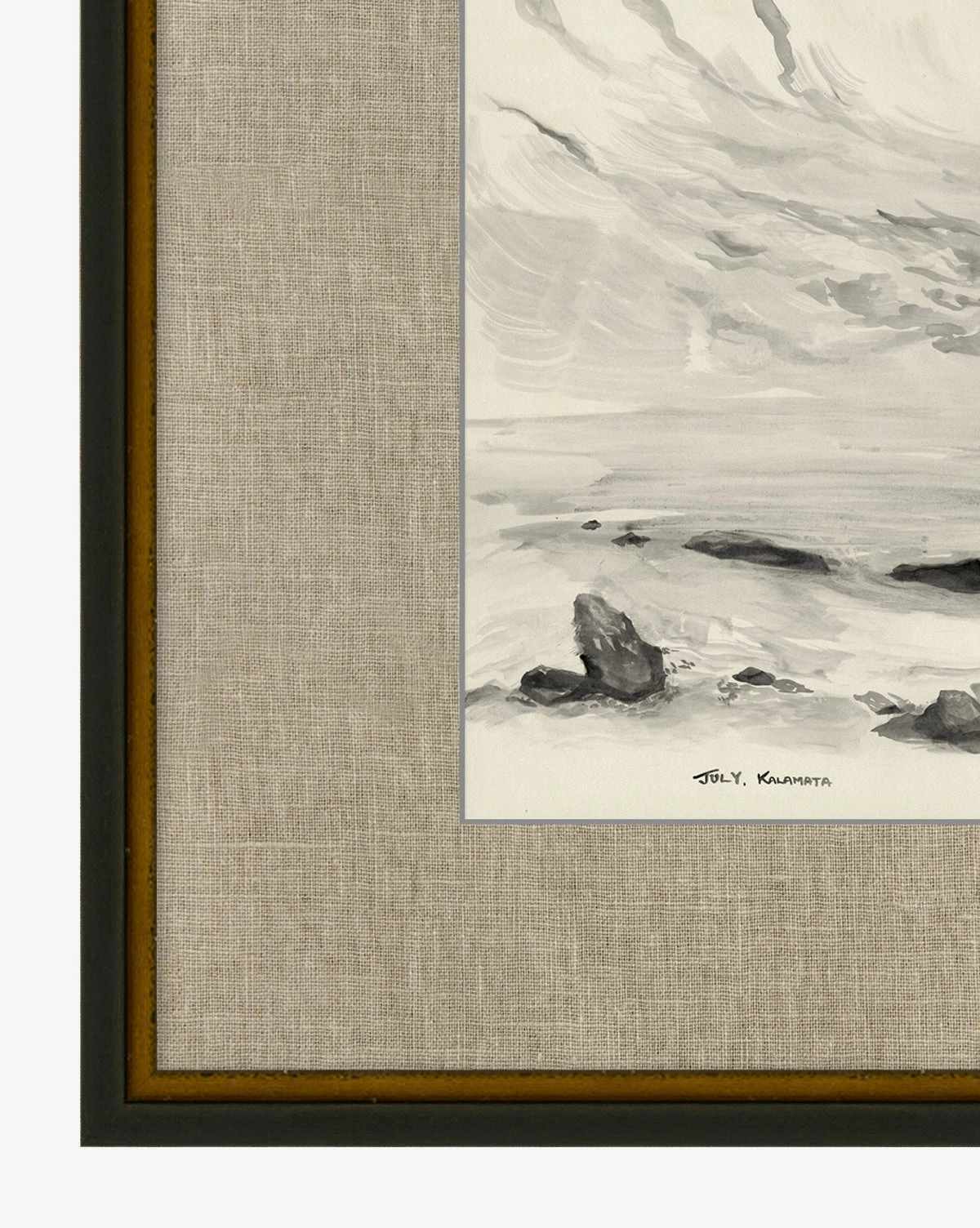 Presented in a distressed black and antique gold frame, July in Kalamata has a tonal palette that embraces the mysterious feel of a stormy seaside. A giclee print on paper, this piece is mounted in a hand-wrapped linen mat.
