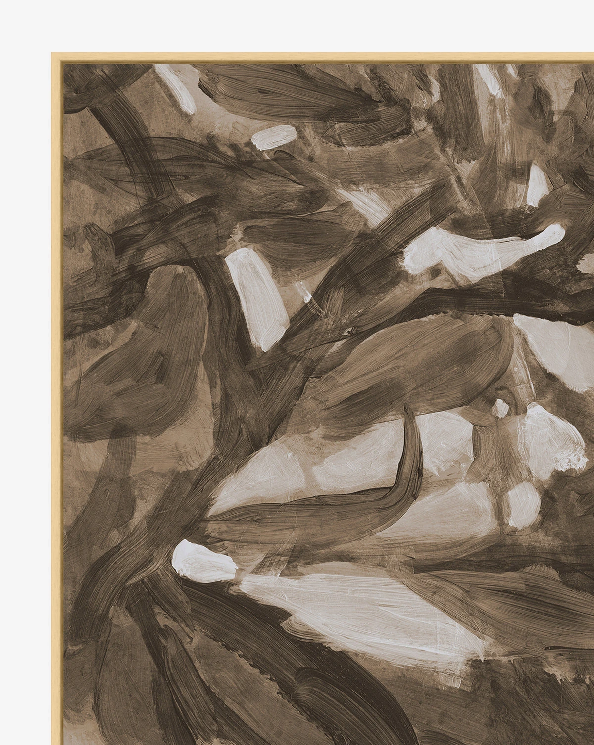 Giclee printed on canvas in a natural wood float frame, Light of Summer is an abstract piece printed in medium scale. In a neutral palette of rich brown and cream, the piece abstractly captures the feel of sunshine peeking through trees. Its warm tone and scale suits it perfectly for a bold accent to grids or to fill smaller spaces with interest. Â