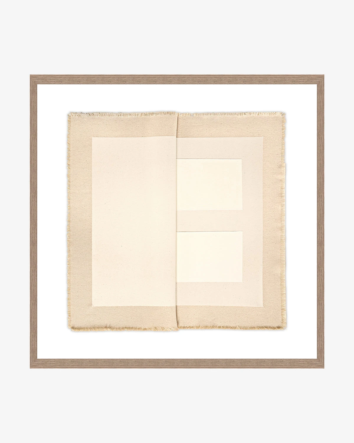 With three-dimensional texture, Mind Division II is a hand painting on fabric. Its frayed edges and folded element bring dimension and detail wherever it is placed. Framed in natural wood, museum-quality materials elevate your decor. Â