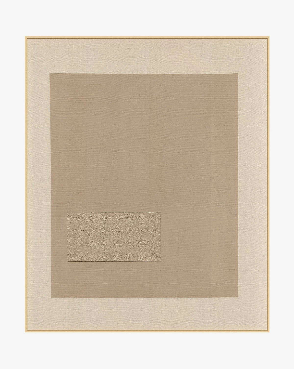 Textural and abstract, Study in Application brings intrigue and depth to your space. Playing with tone and composition, this piece is hand-painted on a gallery-wrapped raw canvas within a natural wood frame. Â