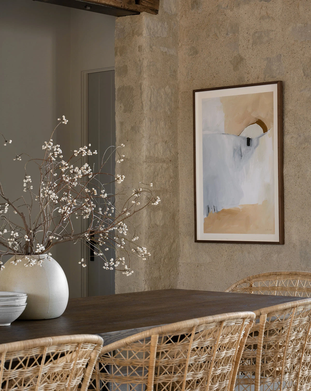 Wavering uses a palette that plays with contrast in a subtle yet masterful composition. Bringing texture and movement into your home, the piece is an archival digital print on gallery-quality paper with a hand- torn edge within a beautiful walnut wood frame. Â